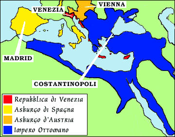 Come si vede, l'estensione dei due imperi (degli Asburgo e ottomano) era schiacciante rispetto ai territori veneziani. Venezia da sola non era in grado di affrontare i due imperi.