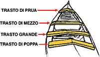 Perpendicularly to the "big trasto" is set the "front piece" that is that board that allows the gondolier to row in the utmost advanced position. And further the "medium trasto" to which it will be leant back of the seat and linked the felze. At last between the big trasto and the stern one there is also a "small trasto".
